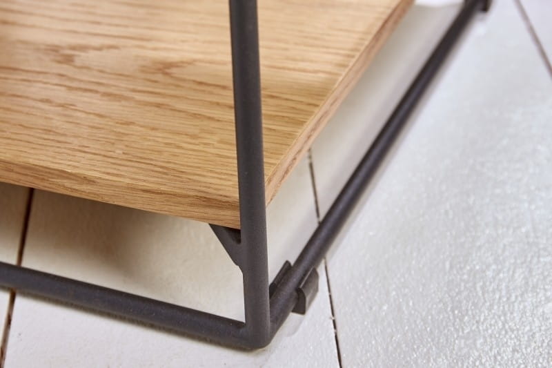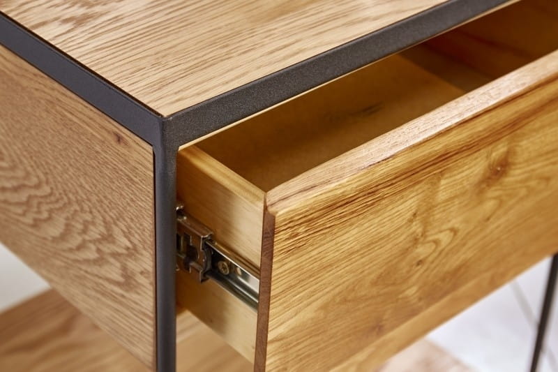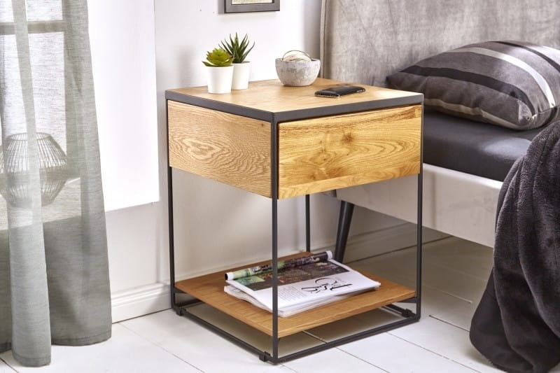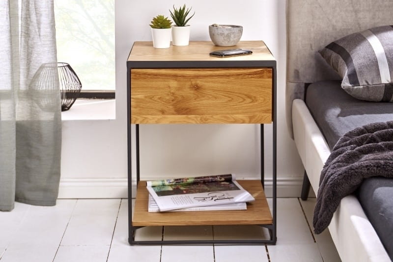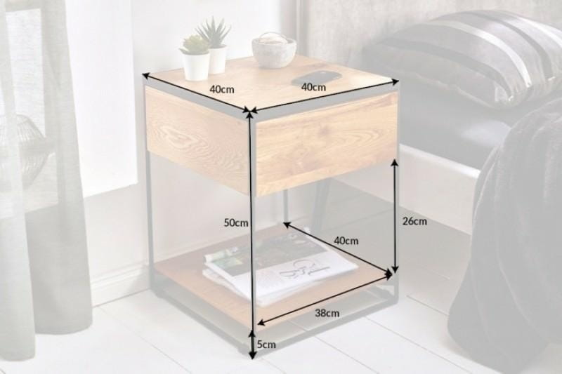 Stolik nocny marki SCORPION został wykonany z wysokiej jakości litego drewna o naturalnym wyglądzie.Rama została wykonana z metalu w kolorze czarnym, który dodaje industrialnego stylu.Produkt został stworzony ręcznie, co powoduje odchylenia w kolorach, które mogą różnić się w zależności od pomieszczenia, w jakim będą postawione.Wymiary: wys. 50 cm / szer. 40 cm / gł. 40 cmSzuflada: wys. 8 cm / szer. 31 cm / gł. 29 cm.